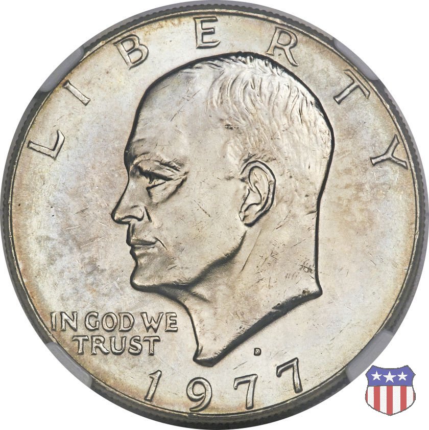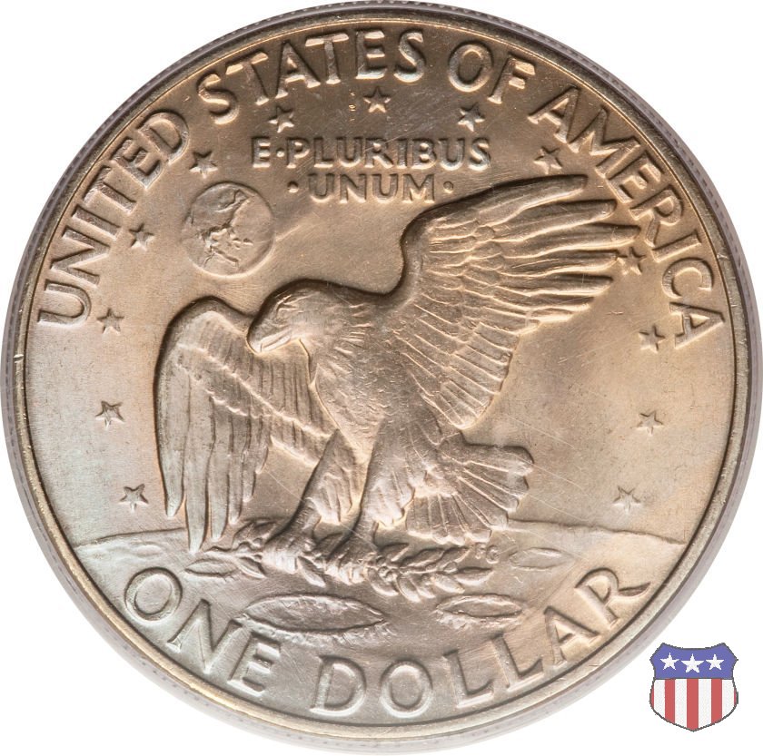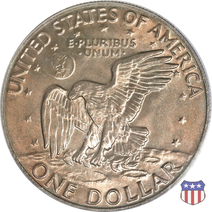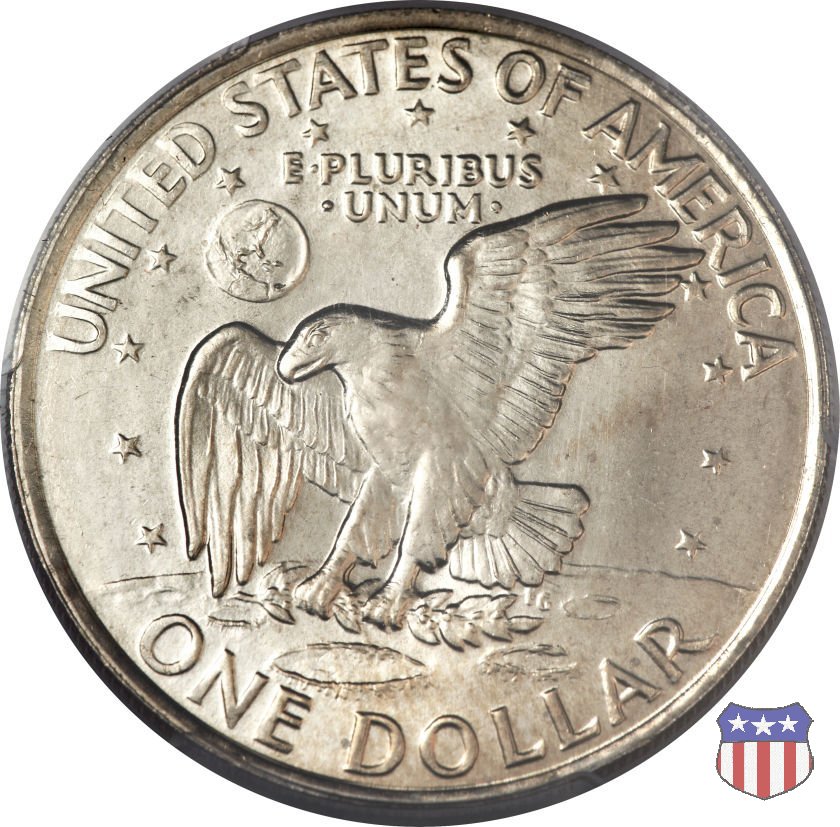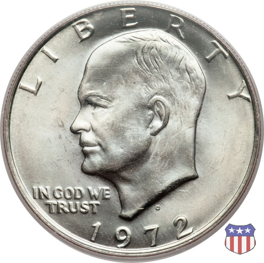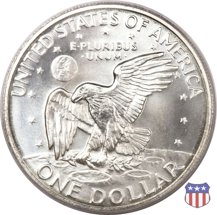 Ma non furono piú monete ad alto contenuto d'argento, come le precedenti, ma prodotte in due leghe diverse, di cui una, detta "Silver Clad" con un basso titolo d'argento (40%) e l'altra, denominata "Clad", in una lega di rame e nickel. Le due monete, di pari diametro, hanno pesi diversi: 24,59 gr. il "Silver Clad", 22,68 gr. il "Clad". Sul dollaro sono commemorati Dwigt D. "Ike" Eisenhower, già Comandante Supremo Alleato nella Seconda Guerra Mondiale, poi Presidente degli Stati Uniti, da poco scomparso (1969) e lo sbarco del primo uomo sulla Luna, con la missione Apollo 11, di cui il rovescio riprende, adattandolo, lo stemma ufficiale. Un accoppiamento che a qualcuno sembrò alquanto forzato, ma che venne giustificato col fatto che fu proprio sotto la presidenza Eisenhower che venne dato il via al programma spaziale degli Stati Uniti, culminato il 20 Luglio 1969 con lo sbarco sul nostro satellite. Nel 1976, in occasione del Bicentenario della Dichiarazione d'Indipendenza, il rovescio del dollaro venne cambiato, con l'inserimento, al posto dello stemma dell'Apollo 11, della Campana della Libertà (Liberty Bell) ma rimase il riferimento alla missione spaziale, con la Luna sullo sfondo della Campana. Nel 1977 e 1978, ultimo anno di coniazione, si tornò poi al precedente rovescio. Segno di zecca: - D Denver - S San Francisco - senza segno Philadelphia | ||||||||||||||||||||